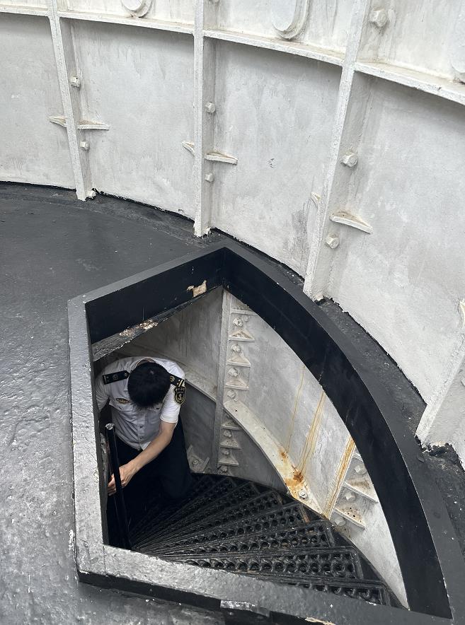 跟着张春华走进灯塔,原本湿热的空气更加炙烫,向上的旋梯就在头顶,楼梯很窄,爬梯时总感觉前者的每一脚好像都踩在自己的头顶。登上海拔70米最高处,张春华站在悬空的支撑台阶上,擦拭灯器,顶部空间密不透风,室内更加闷热,张春华原本上山时湿透了的工作服又湿了一遍。