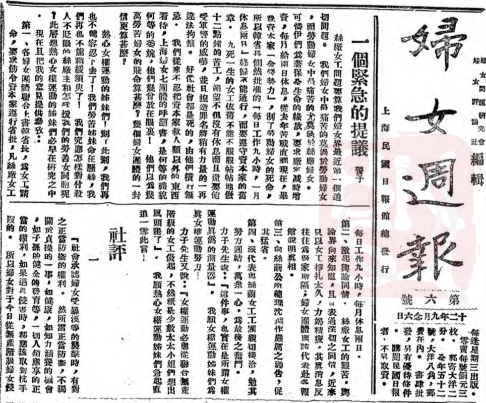 向警予主编的《妇女周报》是唯一能反映全国妇女运动全貌的刊物,成为当时指导全国妇女运动的“精神的中心”。1923年,向警予在《妇女周报》第六期撰文《一个紧急的提议》、《告丝厂劳苦女工同胞》,号召丝厂女工奋起抗争,实现“每日工作九小时,每月休息两日”;以上海海员罢工胜利的经验,教导丝厂女工要在团体指挥下万众一心,“只有团结奋斗是惟一的武器”。