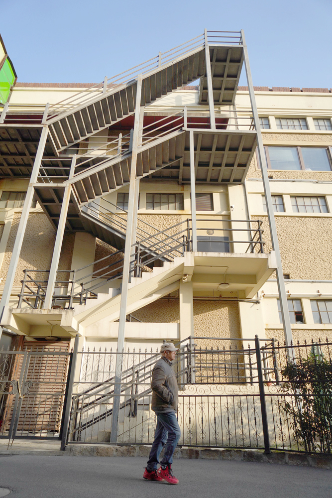 向右步行十多米,是一栋三层楼高的沙黄色建筑,门口写着嘉合基金几个大字。熊晓芳指着建筑的“外跨楼梯”告诉记者,当时仓库的楼梯都比较低平、坡度较缓,便于背负货物的劳工负重上行,而台阶旁则建有带横向波形棱纹的坡道,可以直接将货物从坡道上滑下。