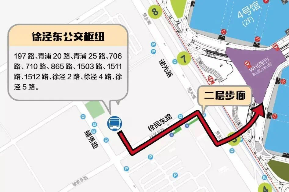 观众到达徐泾东站后,从4、5、6、8号口出站至场馆西登录厅入场;观众离馆时,可从2号线徐泾东站4、5、9号口进站。由于届时徐泾东站客流较大,将会根据现场情况采取限流措施。