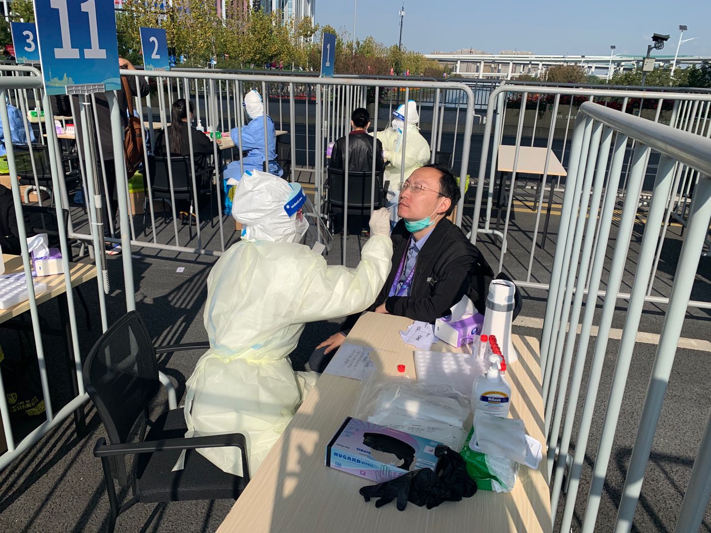 11月1日,距离第三届进博会开幕仅剩3天时间,各项准备工作已进入尾声。在“四叶草”外,核酸采样工作人员正在抓紧做最后的冲刺,为进场工作人员采集鼻拭子样本。昨天,记者实地探访长宁区进博会核酸采样保障队,他们告诉记者,这是上海首次采用10人“混采”方案。