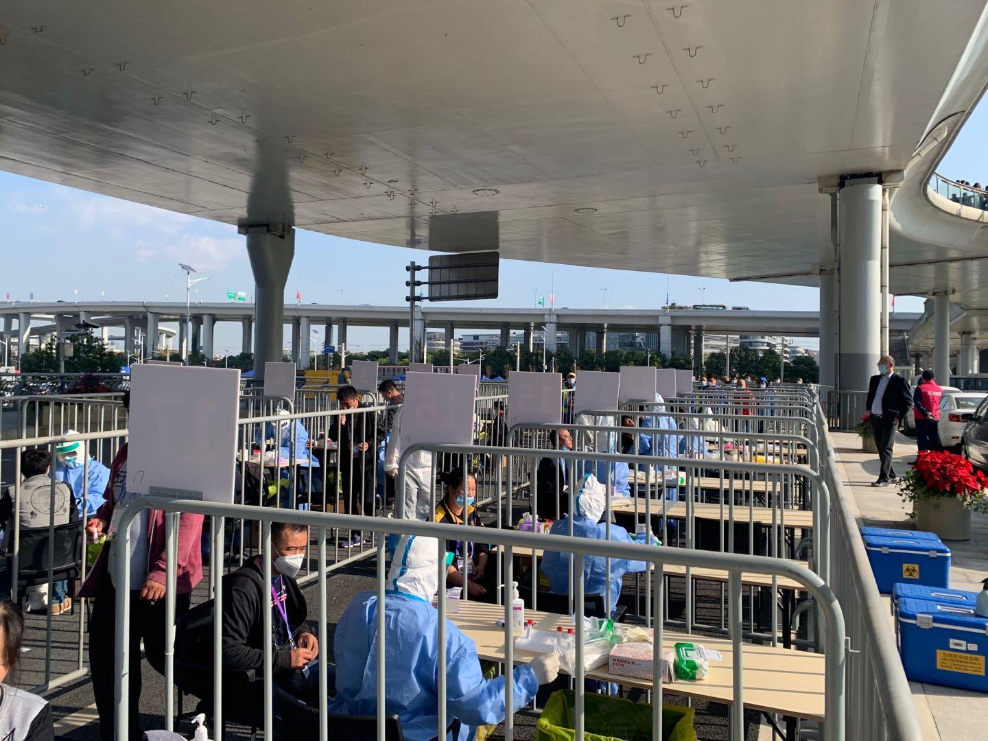 上午8:30,通往国家会展中心场馆的天桥下,有一片区域已经用围栏隔离了起来。这里便是核酸检测采样点,此时等待采样的人群已经排起了十几米长的队伍。
