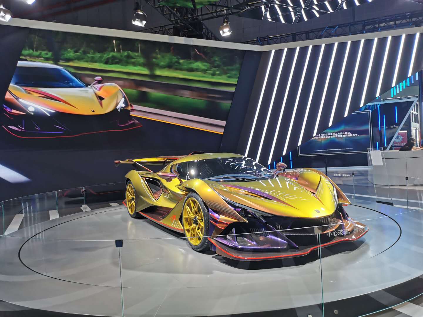 在力世纪展台,全球首款全碳纤维打造的超级跑车已经揭开了神秘面纱。记者了解到,这部跑车是今年力世纪的明星展品,重达1250公斤,最高时速能达到335公里,百公里加速大概在2.7秒左右,流光渐变的配色十分炫酷。