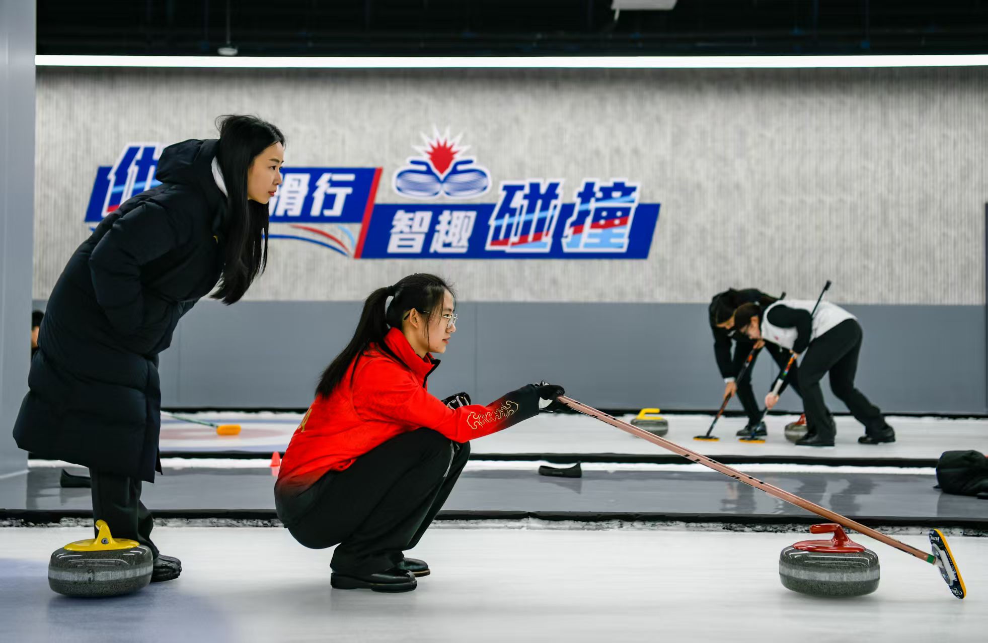 相距近1万公里的上海,普陀冰壶馆内霜气微凝,三根标准赛道上,一批年轻的队员测量、投掷、擦冰,呐喊声此起彼伏……一旁的教练金智善以韩式严谨手势比划线路,又用带着江南温润的中文轻声点拨:“放慢呼吸,心要定。”