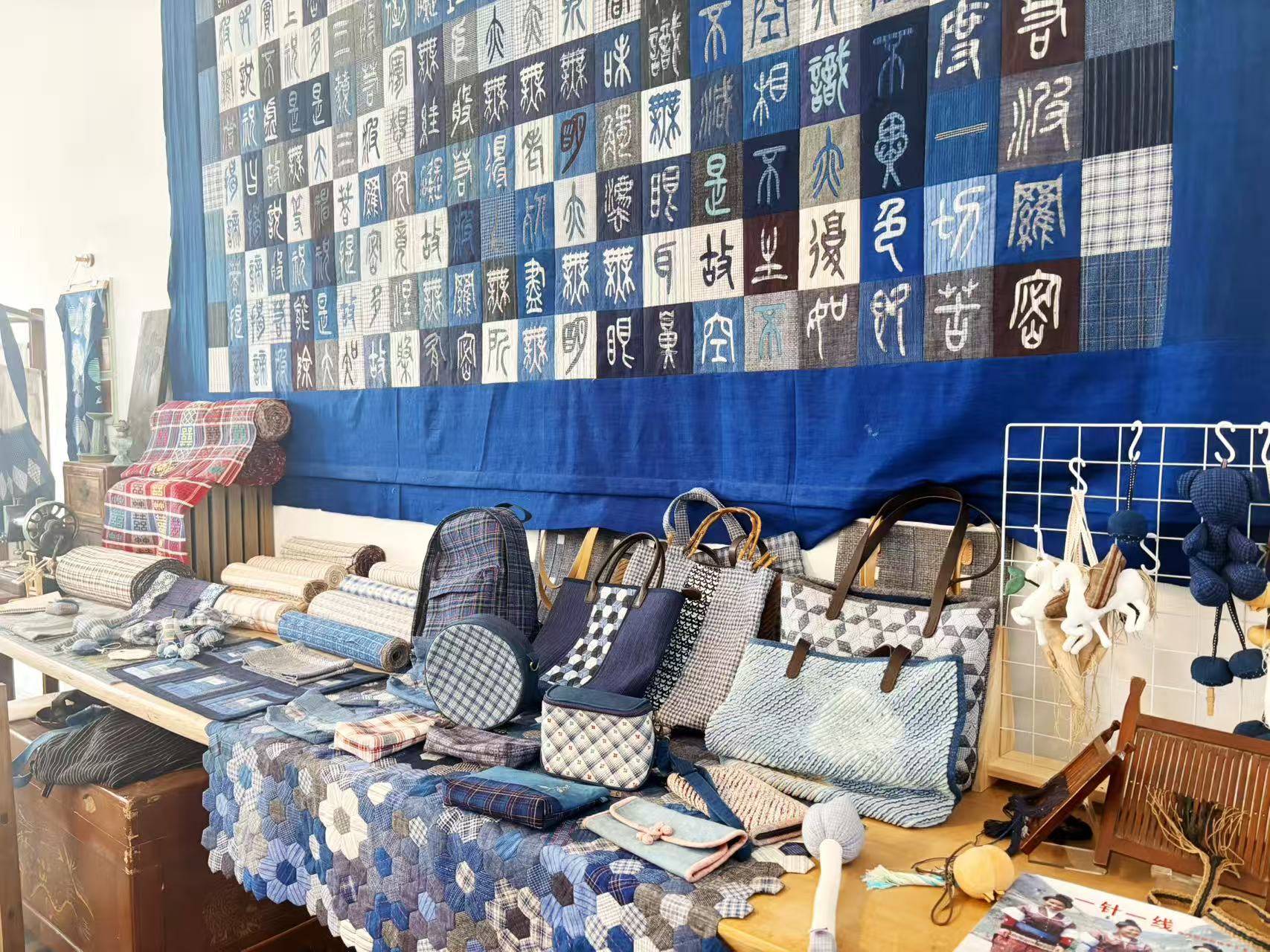 而在下方的工作展陈台上,放置了诸如包包、玩偶、摆件等以土布为原材料所制成的用品。经由文创设计后,使得传统土布焕发新生。