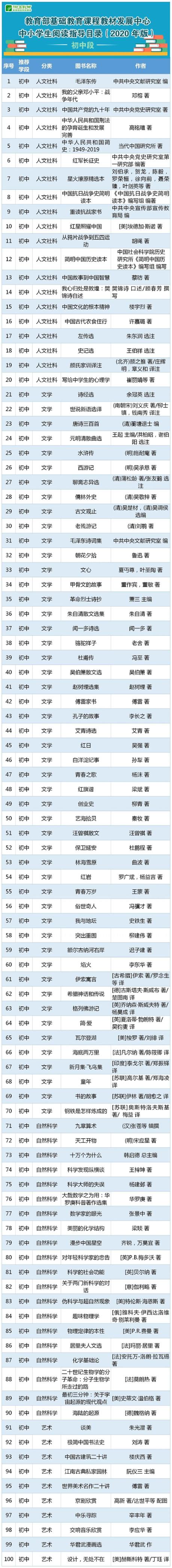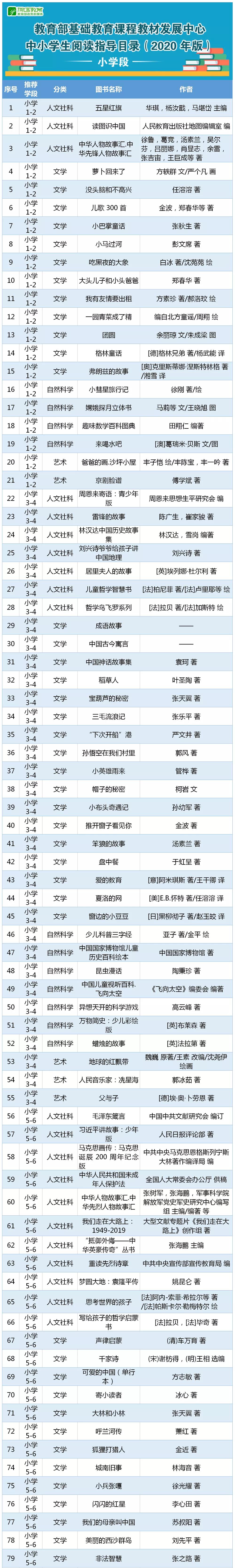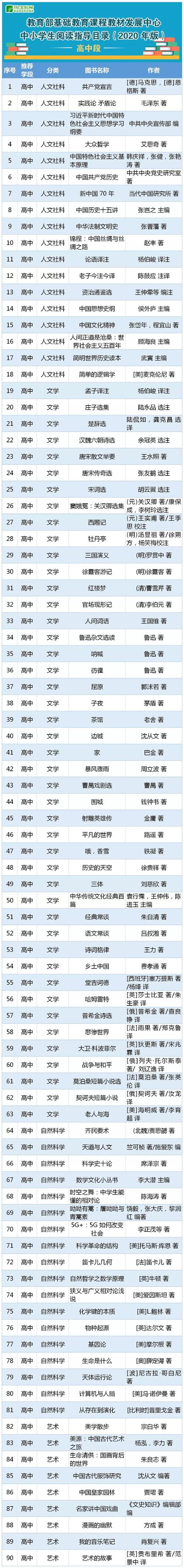 教育部基础教育课程教材发展中心组织研制并发布了《教育部基础教育课程教材发展中心中小学生阅读指导目录(2020年版)》,《指导目录》分为小学、初中、高中三个学段,其中小学110种、初中100种、高中90种。