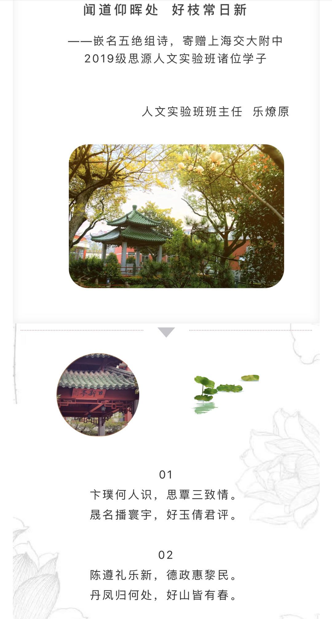 夏日的交大附中,绿意盎然,听胡杰副校长如数家珍:这幢是“蘅仲楼”,为纪念语文教育家沈蘅仲先生而命名,老乐撰写的沈老生平事略,挂在一楼,字里行间,两位交中语文特级教师一脉相承的人文精神,让人感怀;这个是“日新亭”,经老乐提议而命名,亭子向北的两个柱子上镌刻着一副楹联,是唐人张子厚的名句——“愿学新心养新德, 长随新叶起新知”,老乐为此创作的五绝组诗《闻道仰晖处,好枝常日新》,更是让他的学生和家长们沉吟涵泳……