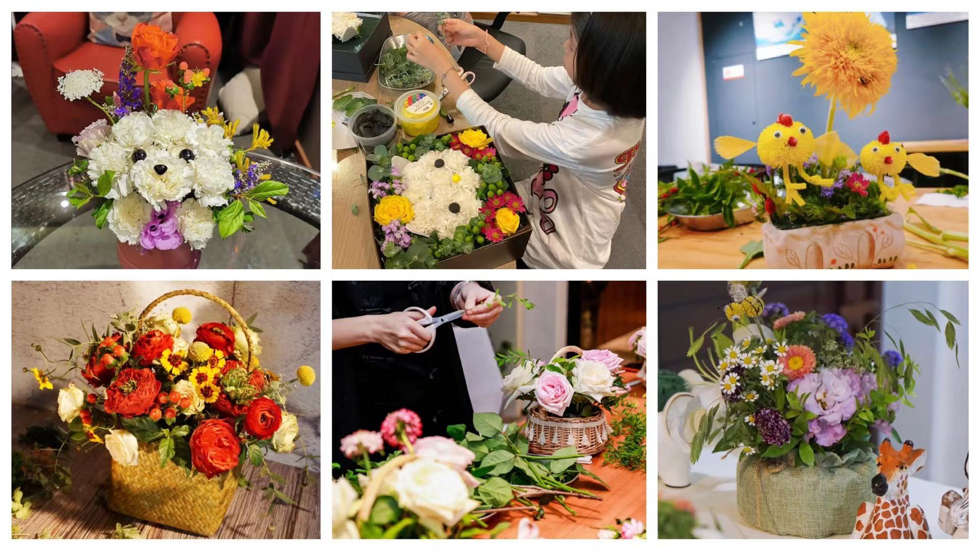 过程也很有趣:迷你菊、相思梅、乒乓菊、泰迪向日葵、红色鸡冠、银牙柳、绿毛球、鼠尾……老师会一步步教孩子们怎么插,怎么修剪,各种美丽的鲜花在老师神奇的魔法下摇身一变成了造型可爱的小狗、微型的花园……