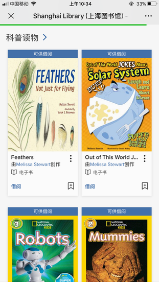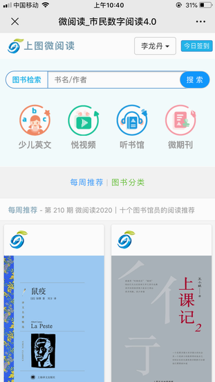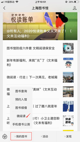 进入“上海图书馆”微信公众号,点击“我的图书”-“微阅读”进入![]()