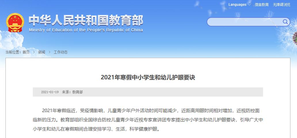 教育部组织全国综合防控儿童青少年近视专家宣讲团专家提出中小学生和幼儿护眼要诀,引导广大中小学生和幼儿在寒假期间合理安排学习、生活,科学健康护眼。