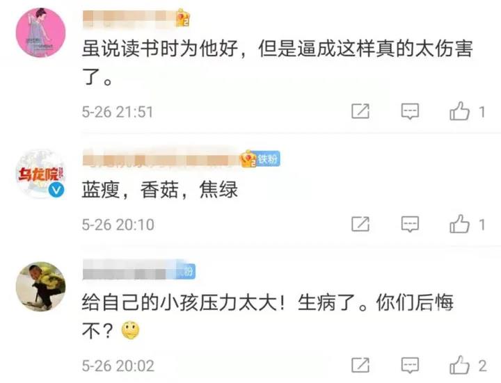 也有网友理解家长,但“逼成这样真的太伤害了”“生病了你们会后悔的”。