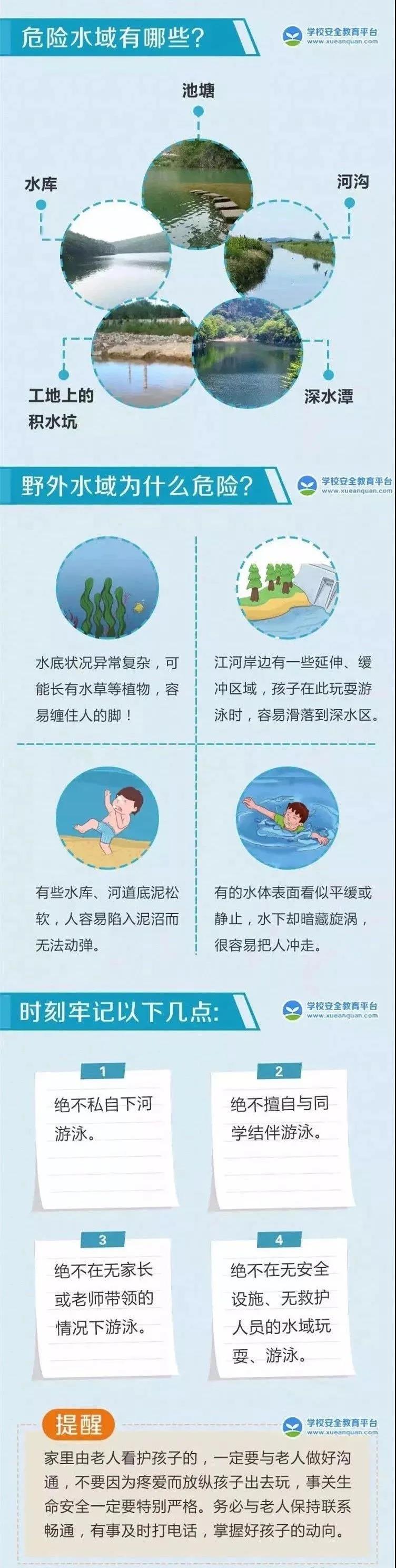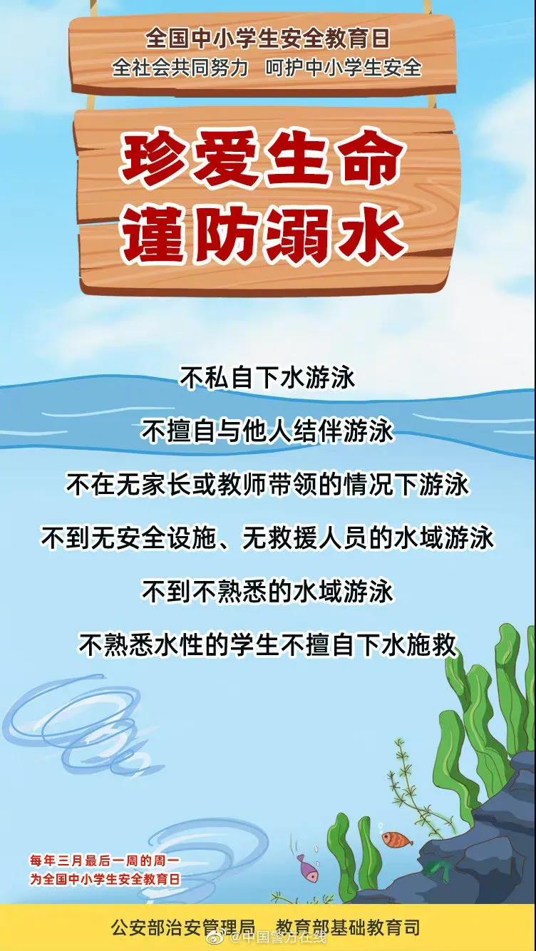 随着气温逐渐升高,未成年学生溺水安全风险逐步增大。加强对孩子的安全教育和管理显得尤为重要,特别是加强放学后、周末、节假日期间和孩子结伴外出游玩时的管理。