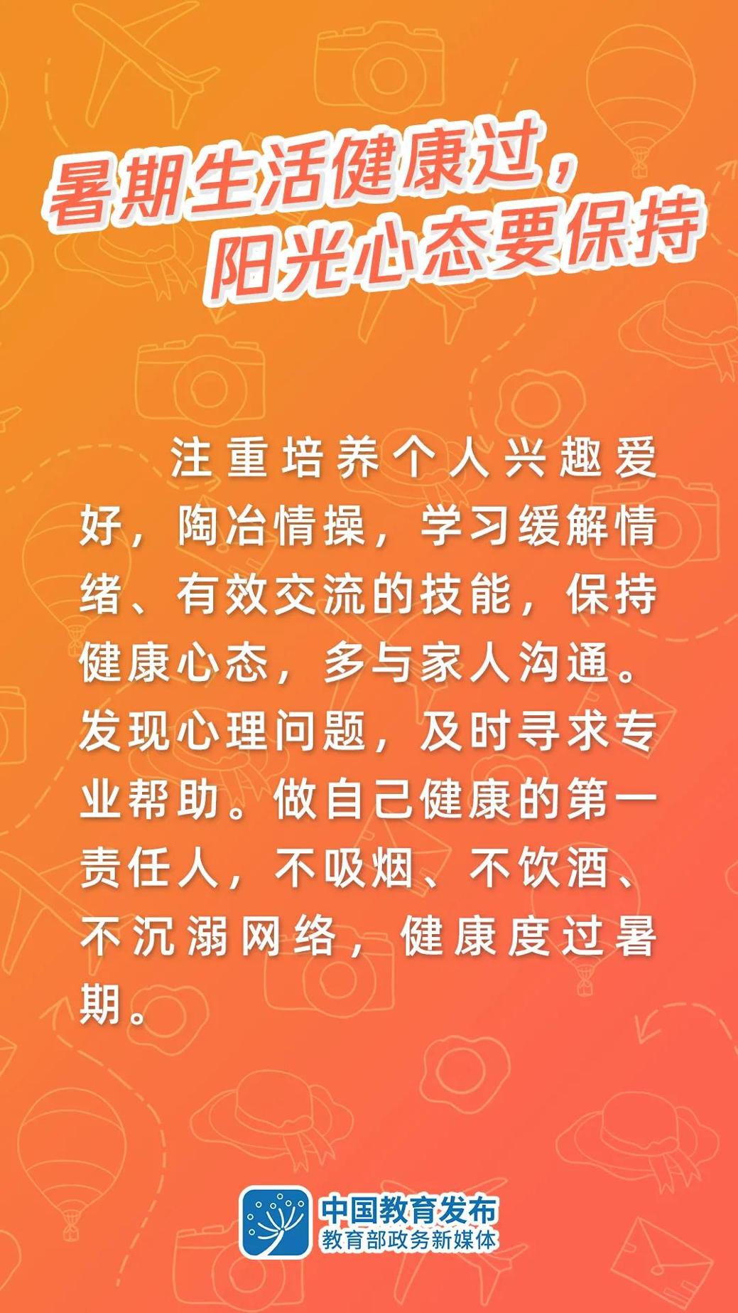 摘要: 暑假里,教育部提示引导中小学生和幼儿合理安排假期生活和学习,加强体育锻炼,保持健康生活方式。