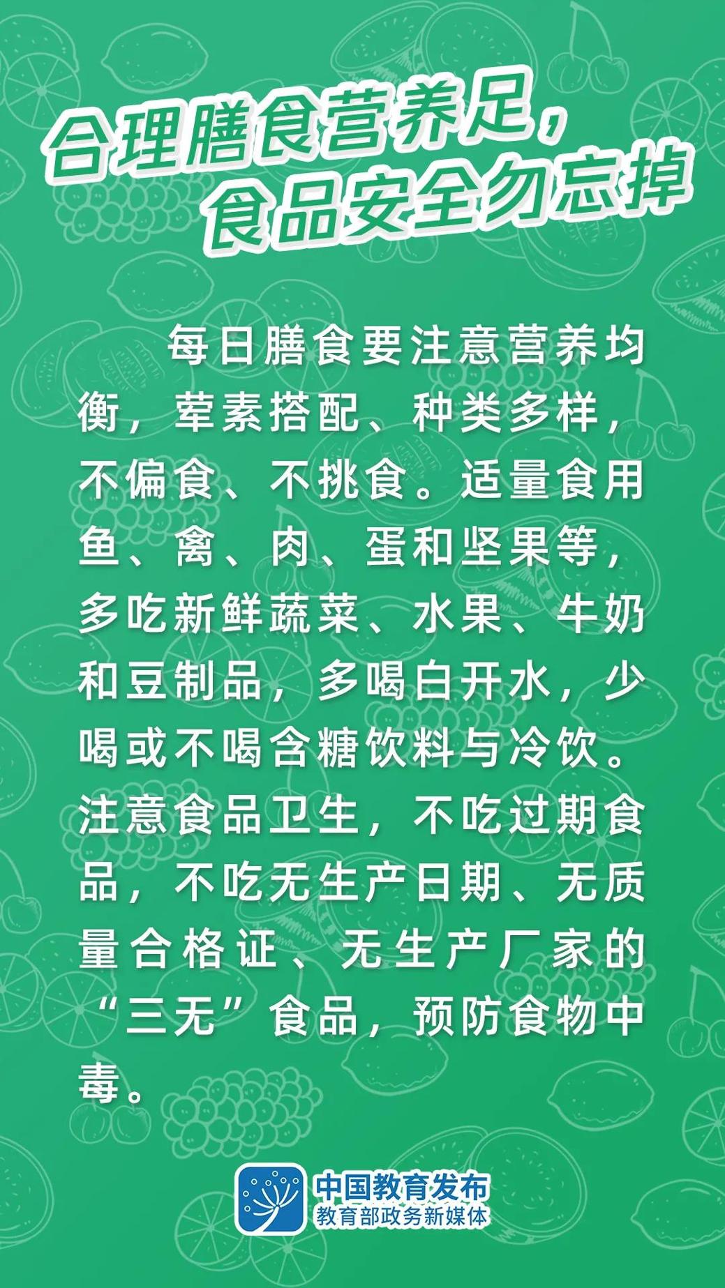 近日,教育部指导全国中小学健康教育教学指导委员会专家,提出2021年暑期中小学生和幼儿健康生活提示要诀,引导中小学生和幼儿合理安排假期生活和学习,加强体育锻炼,保持健康生活方式。大家一起来看要诀大图——