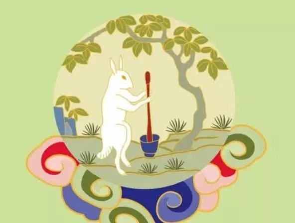 玉兔捣药,道教掌故之一,见于汉乐府《董逃行》。相传月亮之中有一只兔子,浑身洁白如玉,所以称作"玉兔"。这种白兔拿着玉杵,跪地捣药,成蛤蟆丸,服用此等药丸可以长生成仙。久而久之,玉兔便成为月亮的代名词。
