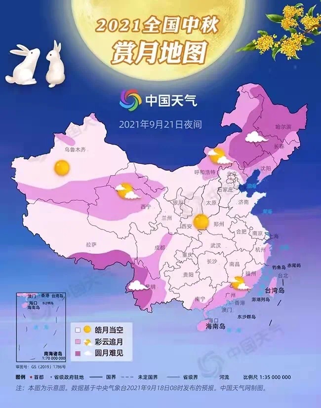 中秋期间赏月效果还得看各地天气情况。中央气象台的赏月天气预报显示,中秋节当天,也就是9月21日晚,除我国东北地区和四川盆地西部以外,全国大部分地区云量较少,气象条件有利于当晚赏月。