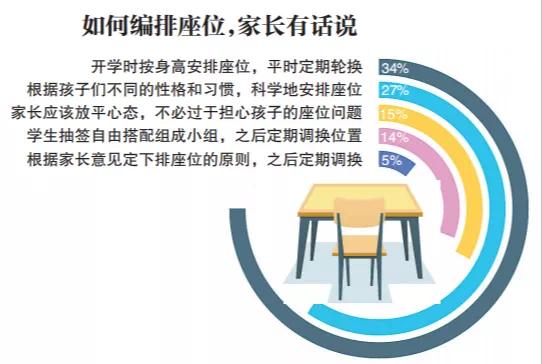 如何保证班级座位公平公正?在调查中,超六成家长支持“开学时按身高安排座位,平时定期轮换”及“根据孩子们不同的性格和习惯,科学地安排座位”。对此,田冰冰建议,首先要让座位流动起来,通过左右循环、前后循环等方式,保持调整的固定节奏。其次要让座位的安排更趋向合理,均衡组合班内学生,发挥不同学生相互促进的作用。她举例介绍:“如果发现个别学生有成绩掉队倾向,可以适当安排成绩优异有余力的学生来进行点对点帮扶。”