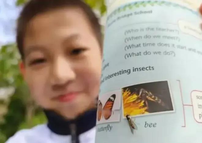 “我在预习沪教版英语教材时,发现第95页有点小问题。第95页上有3张小昆虫的照片,按英文的说明分别应该是蝴蝶、蚂蚁和蜜蜂;但是图片上却是蝴蝶、蚂蚁和食蚜蝇……”近日,沈阳市126中学7年级学生崔宸溪把自己的发现反映给上海教育出版社。当被询问道“怎么发现教材问题”时,崔宸溪回应:“其实也挺简单的,就是蜜蜂有两对翅膀、食蚜蝇只有一对……蜜蜂的触角很明显,食蚜蝇的不明显。”他的妈妈表示,生物学是小崔从小最喜欢的一门学科。有多喜欢呢?