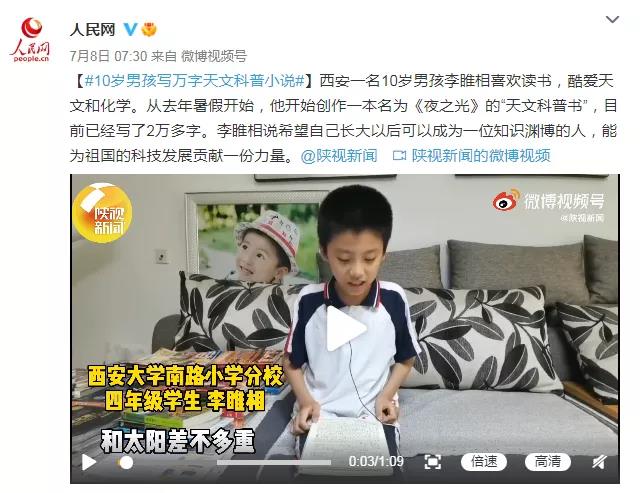 这位小朋友从去年暑假开始写这本书,目前已经写了两万多字。他希望这本书能用有趣的方式,给小朋友们科普天文知识。谈到未来,李睢相希望长大以后,可以成为一位知识渊博的人,能为祖国的科技发展贡献一份力量。这个侃侃而谈的自信男孩,眼中有着掩藏不住的对科学知识的热爱。正如有网友评论说:“唯有热爱可抵岁月漫长!”因为热爱所以愿意坚持,哪怕遇到再多困难险阻,依然初心不改。这才是孩子们成长中最大的幸运。