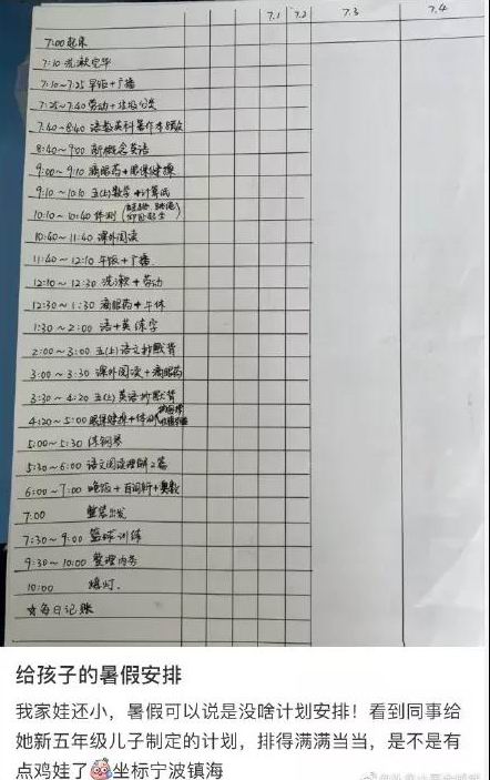 之前,在网络上看到了一位妈妈给开学上小学五年级的儿子制定的暑假计划表。很多网友都表示:“老师看了都要窒息!”从早上7点起床,到晚上10点就寝。一天的15个小时内,除了每顿饭的20分钟,其余时间都被无缝切割成各学科的学习时间。
