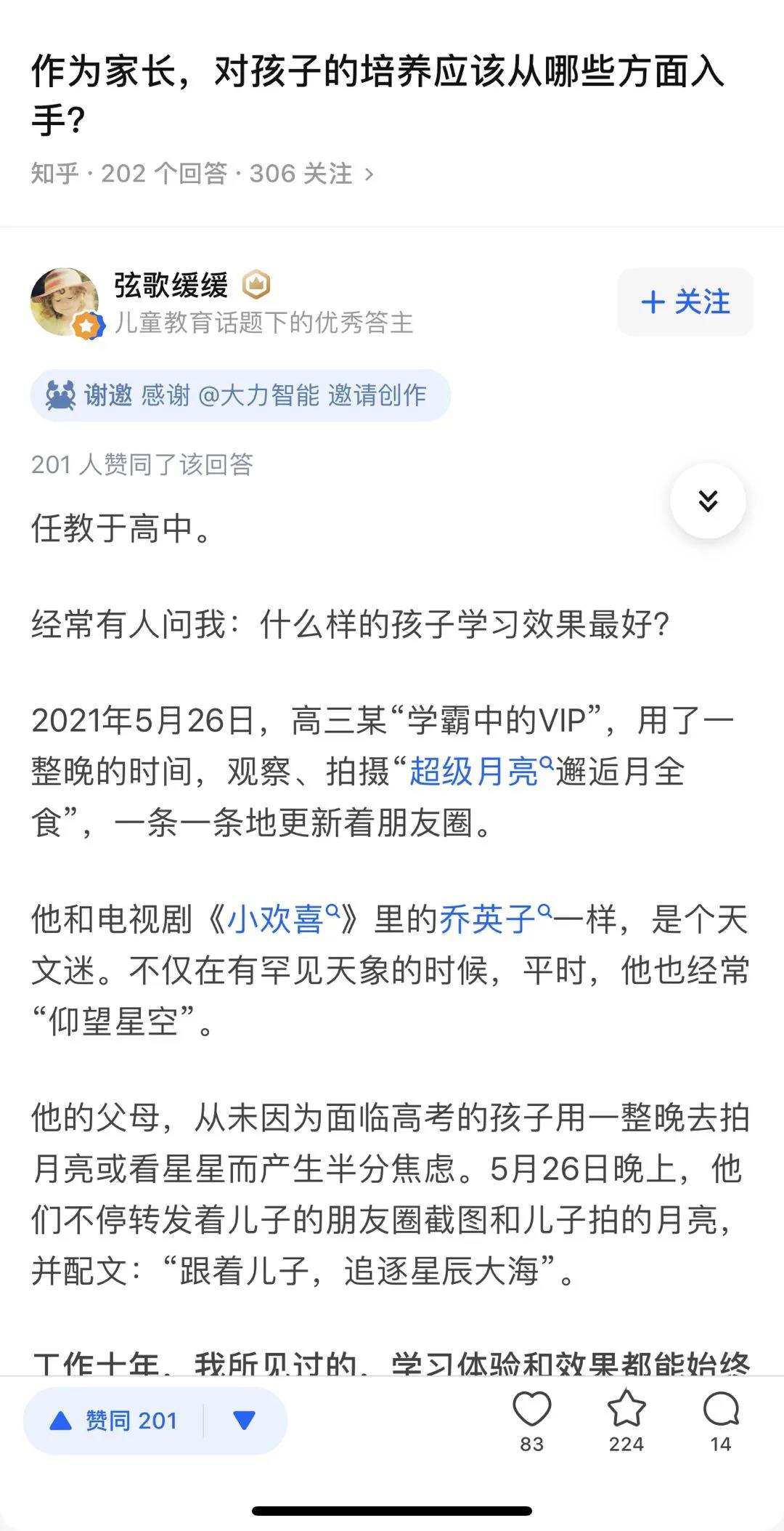知乎上有位叫“弦歌缓缓”的高中老师,讲述了在今年的5月26日,高三的一位超级学霸,用了一整晚的时间,观察、拍摄“超级月亮邂逅月全食”的过程,并且一条一条更新着朋友圈。而学霸的父母,一点都没有因为临近高考,孩子却用一整晚的时间去拍月亮而焦虑。他们反而转发儿子的朋友圈,并且配文说:“跟着儿子,追逐星辰大海。”