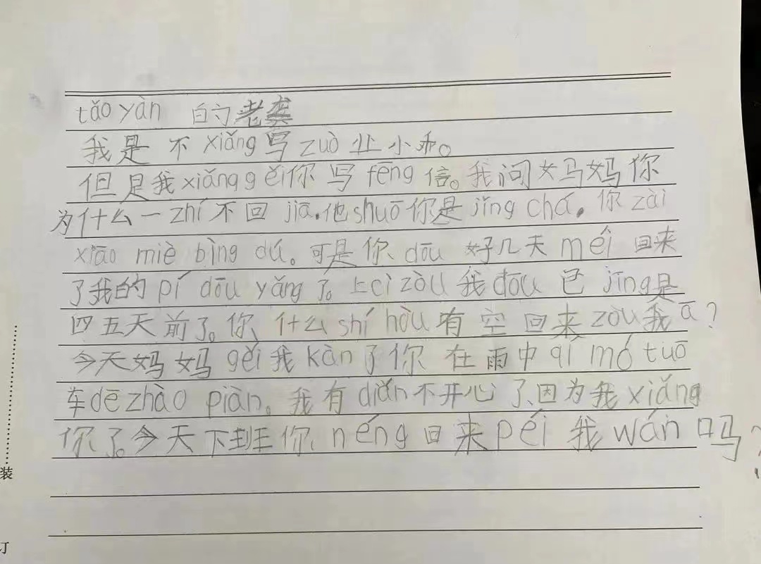 近日,江苏常州,7岁儿子写信问爸爸:“你什么时候有空回来揍我?”