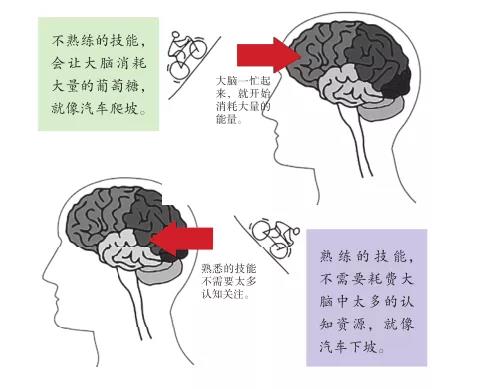 看见上面这个图了吗?没养成习惯的新手,大脑要耗费大量的葡萄糖,等你养成习惯,大脑就不会耗费多少葡萄糖了。