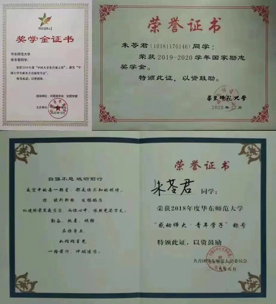 让小朱最开心的是,她在学习上的努力和付出得到了认可。功夫不负有心人,小朱大一至大三专业成绩排名第一,英语科目全A,连续三年获评“国家励志奖学金”,被共青团中央、全国学联评为2019年度“中国大学生自强之星”。2021年获评华东师大“校长奖学金”、“人才学院优秀学员”和学校“十佳女大学生”称号。