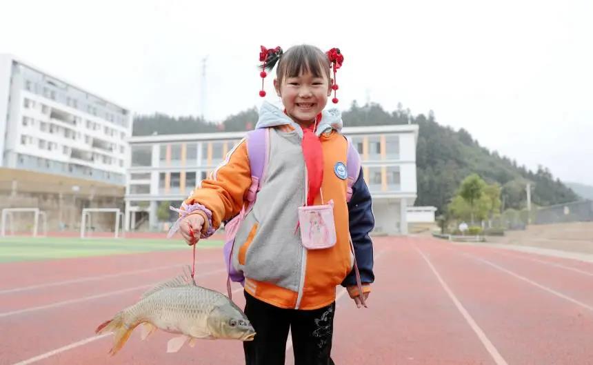 在三江侗族自治县古宜镇江川小学,学生们在展示“鲤鱼奖品”。龚普康摄
