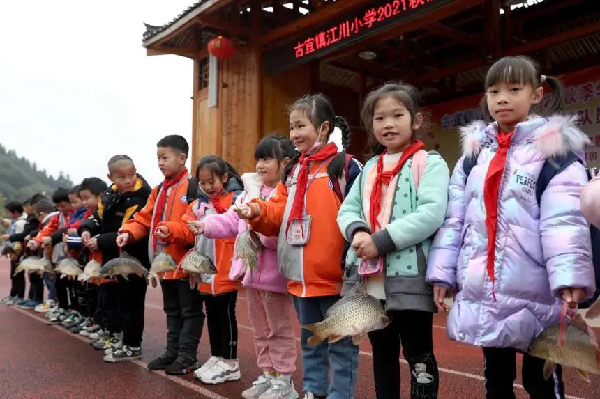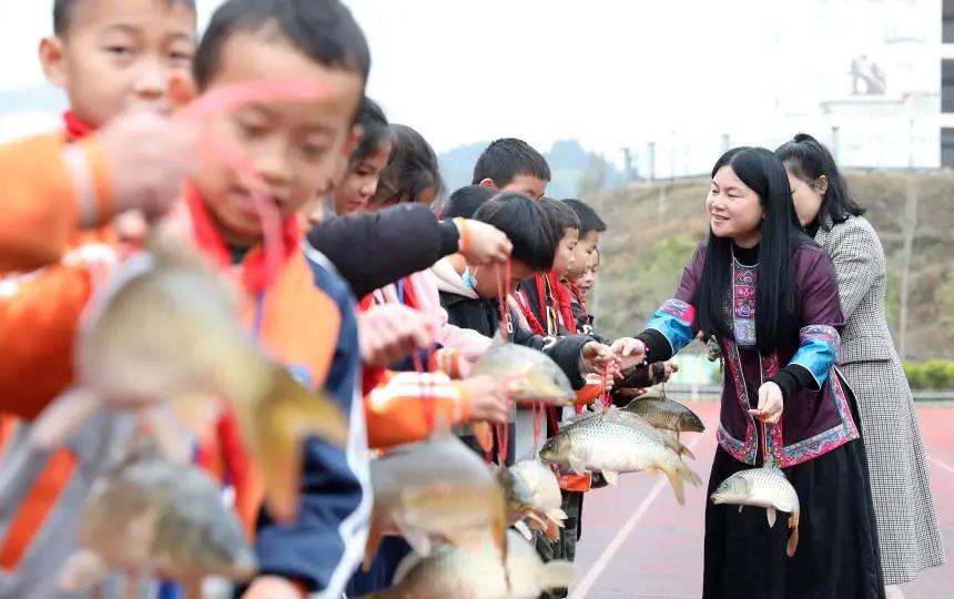 1月21日,广西三江侗族自治县古宜镇江川小学举行2021年秋季学期散学典礼暨颁奖仪式,向全校420余名品学兼优的易地搬迁学子,每人奖励一条一公斤多重的活鲤鱼,勉励学子们发奋勤学,鱼跃龙门,从小立志以知识改变命运。