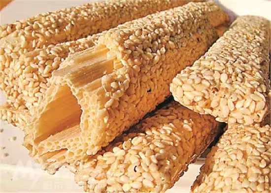 灶糖,外面有一层芝麻,里边是用麦芽糖凝固而成的,有健脾胃、滋阴清火、润肺止咳的功效。