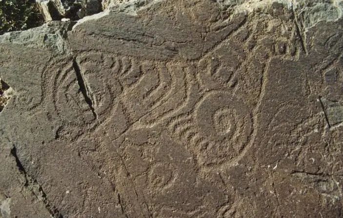 “五虎图”是阴山岩画中一组具有代表性的作品,刻绘于虎沟的岩石上。整幅图画有动有静,表达了中国北方先民对自然的崇拜,也向人们揭示了自然界中的生命图腾,令人叹服。