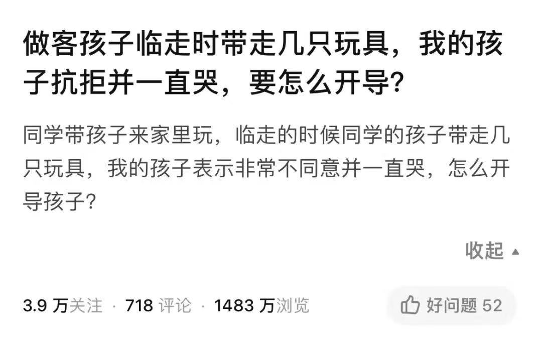 知乎上有一个话题是,朋友带孩子来家里做客,临走时带走几只玩具,我的孩子抗拒并一直哭,要怎么开导?
