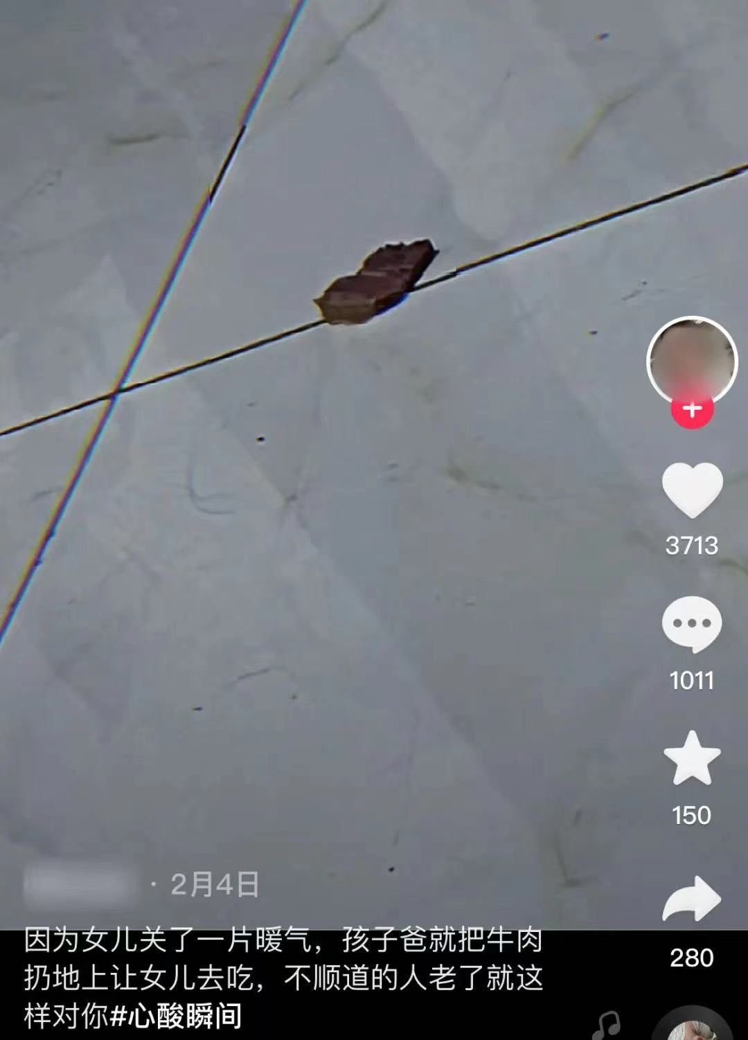 一位妈妈说,因为女儿关了一片暖气,孩子爸就把牛肉扔地上让女儿去吃。