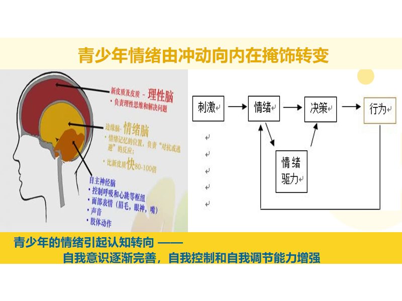 一般成人思考、解决问题或人际交往,往往是通过自己的思维进行理性思考。但是青春期的孩子一般来说表现出来的理性思考能力较弱,因此常常用情绪来决策。青春期的孩子会通过社会互动,逐步地从情绪的冲动向情绪的内在掩饰转变,随着自我意识的逐渐完善,他们调控自己的情绪冲动,自我控制的能力和自我调节的能力逐步提高。
