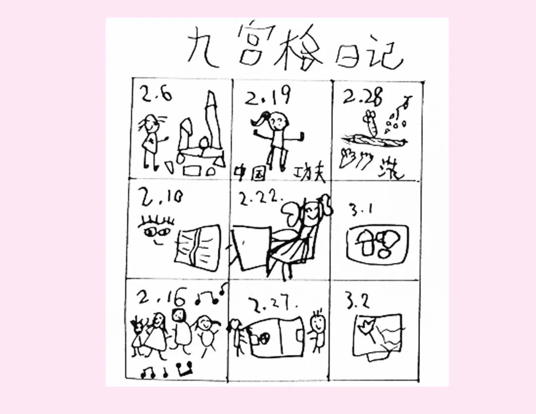 建议大班孩子玩。鼓励孩子细心观察生活中的人和事。亲子共同回忆家庭生活,讨论各种小事带来的不同感受,并用简笔画的方式记录,画满9个为止。