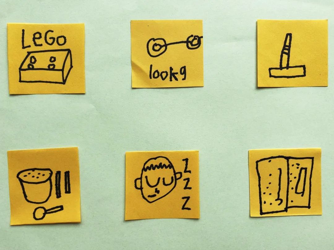 1)全家每人用纸记录当天的几件事,将画面朝下。彼此随意翻开其中一张,共同解读,猜测记录内容。
