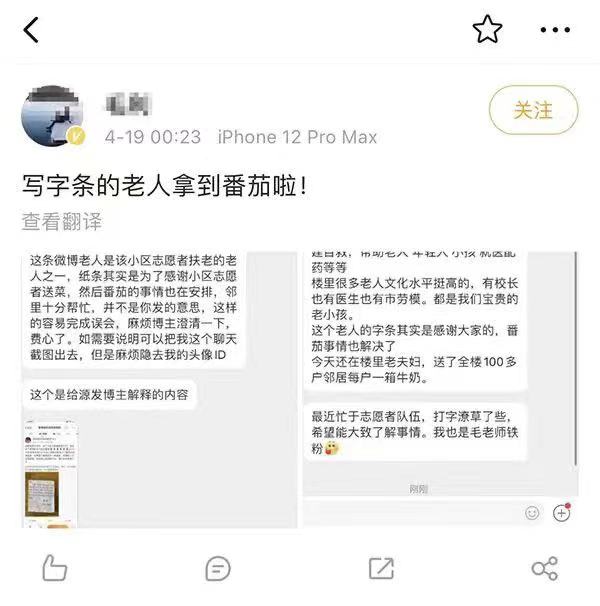 这张字迹工整的小纸条也在爷爷所居住的上海市长宁区周家桥街道某小区志愿者帮扶小队群里流传,没多久,群里就有了反应,有住户说有半箱番茄,可以拿来分。当天,番茄就来到了郑爷爷的手中。