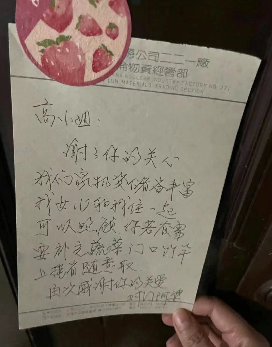 有年轻人担心对门96岁的阿婆物资不充足,在她门口贴了张字条:“有需求随时找我。”