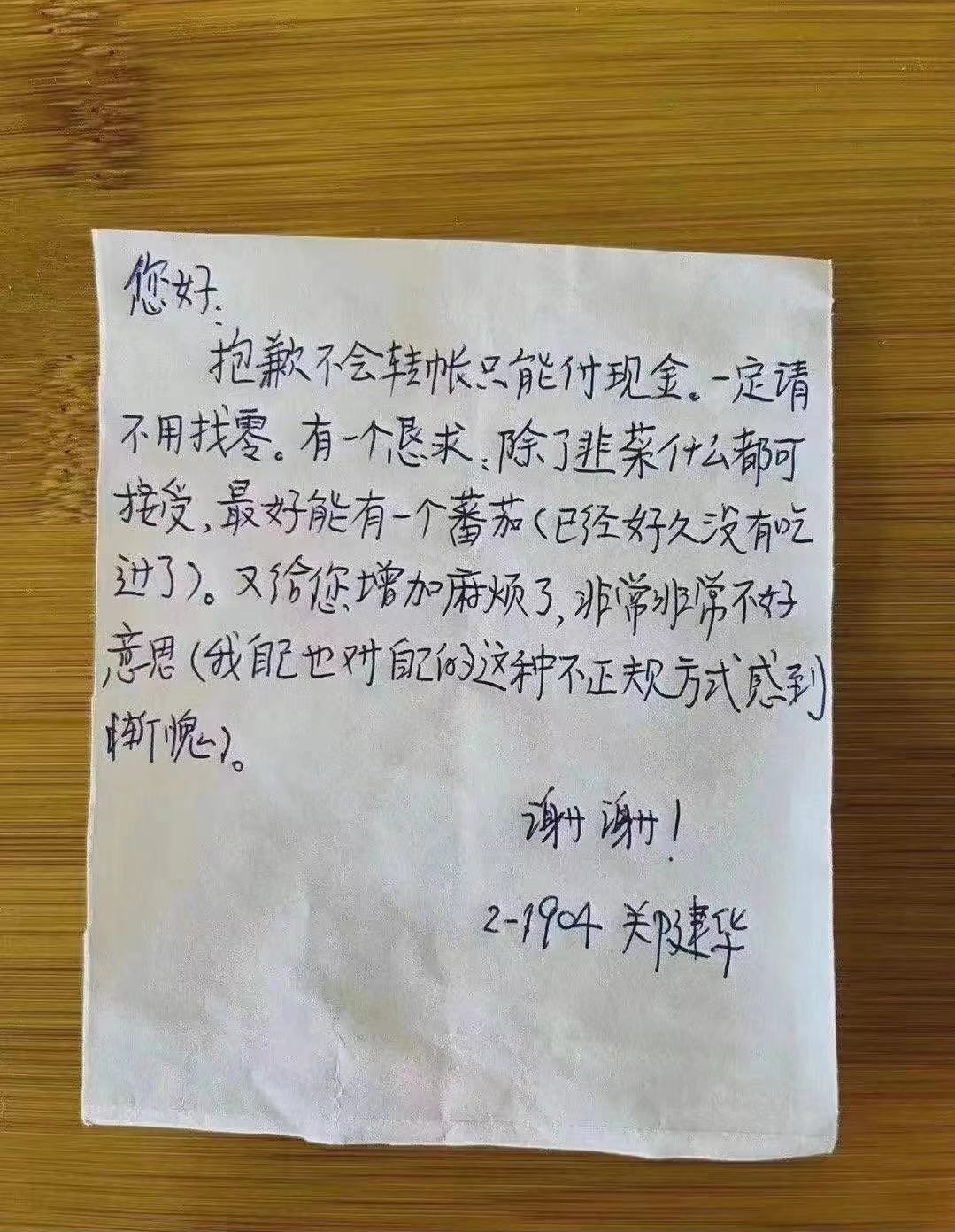 小区志愿者小金介绍,当时郑先生想参加蔬菜团购,但还没学会微信转账,就不好意思地拿着这张纸条请志愿者帮他团除了韭菜以外的任何蔬菜,最好能有番茄。