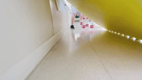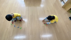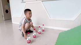 用桌子或地垫等材料形成坡面,家长可从不同位置将矿泉水瓶从坡面滚落,孩子仔细观察并挪动底部矿泉水瓶,确保其不被碰倒。
