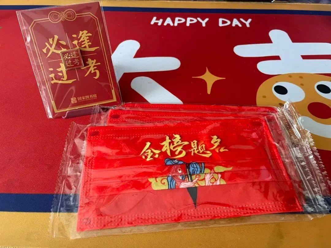 有“火红的福袋”,里面印有“旗开得胜”“前程似锦”等祝福的短袜,还有印有“考试顺利”“高分考过”“考神附体”“考的都会”“金榜题名”等字样的口罩,还有的口罩绣着锦鲤;