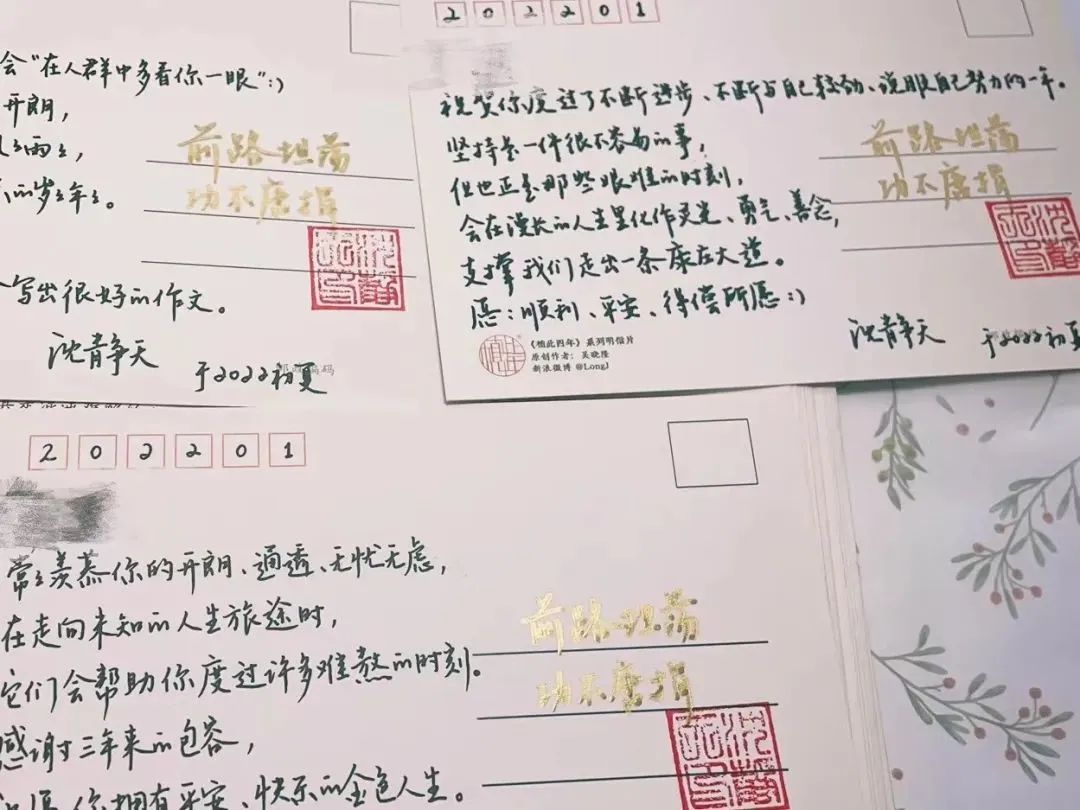 还有老师亲手书写的“加油明信片”,配上书写时所用的水笔,赠送给每位同学,祝愿同学们高考时“妙笔生花”。