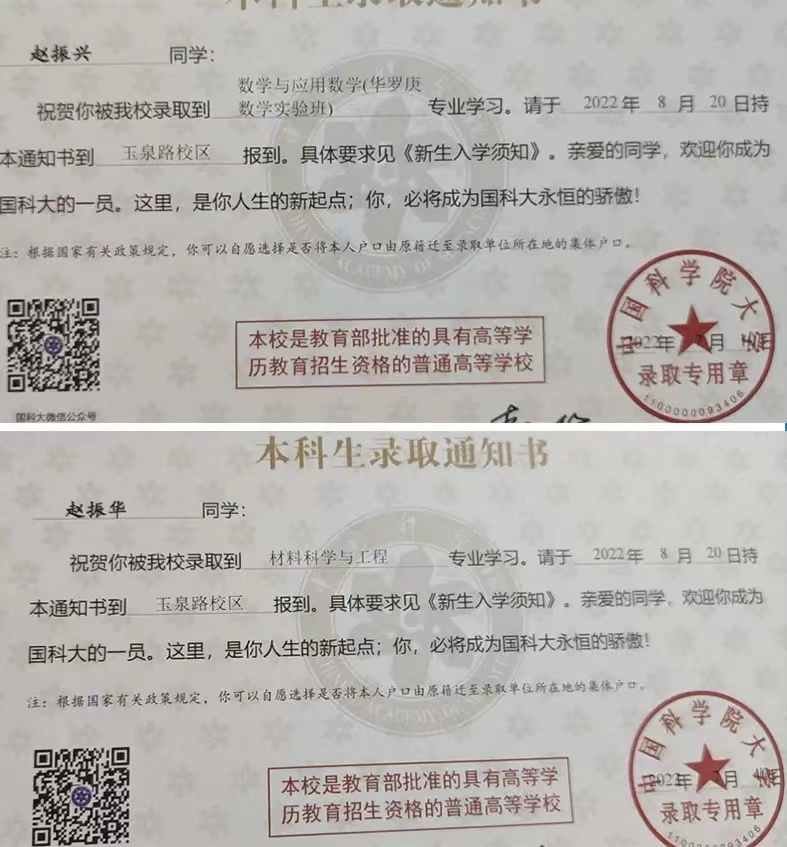 赵振中说,查到高考成绩后,他们三人高兴又意外,“成绩都比预估要好一些,分别是664、674、654,排起来刚好是个等差数列”。7月10日,大哥赵振兴与三弟赵振华已收到中国科学院大学的录取通知书,赵振中则被北京大学预录取。