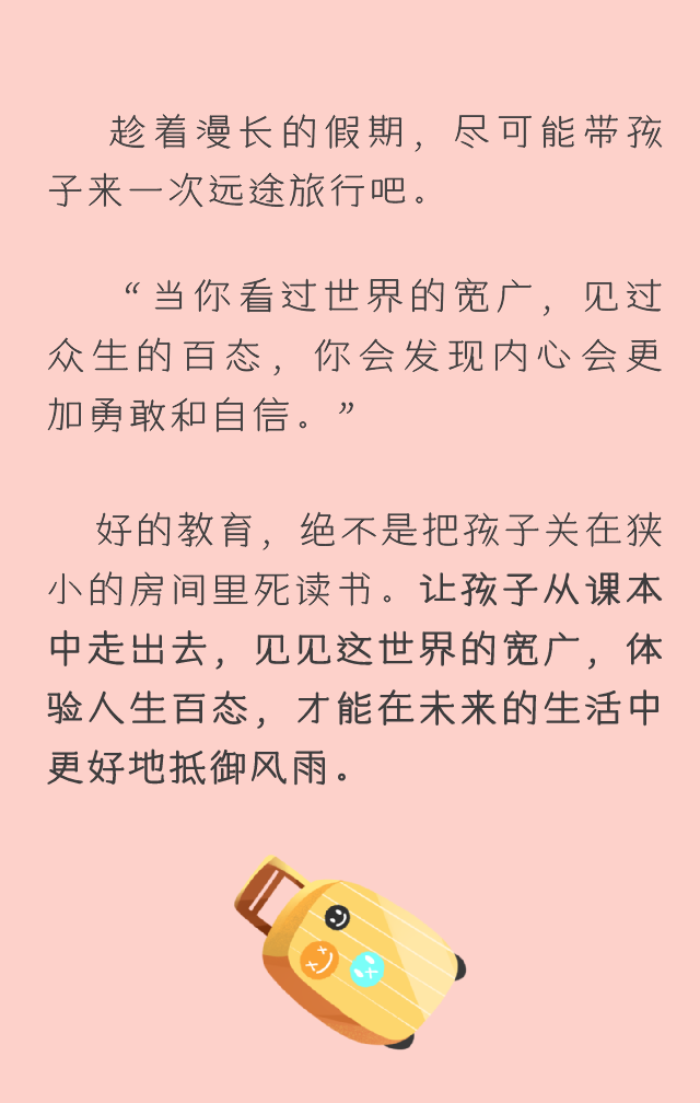 暑假就是将孩子们从密集的学业中抽离出来,提升自我、锻炼自己综合能力的最佳时期。希望每个孩子都能在父母的陪伴下度过一个充实、有趣、意义非凡的暑假。