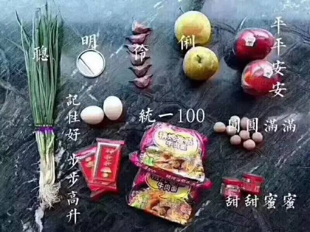 还有“烤果”谐音“考过”、“糕”谐音“高”、“统一100”寓意“考100分”……