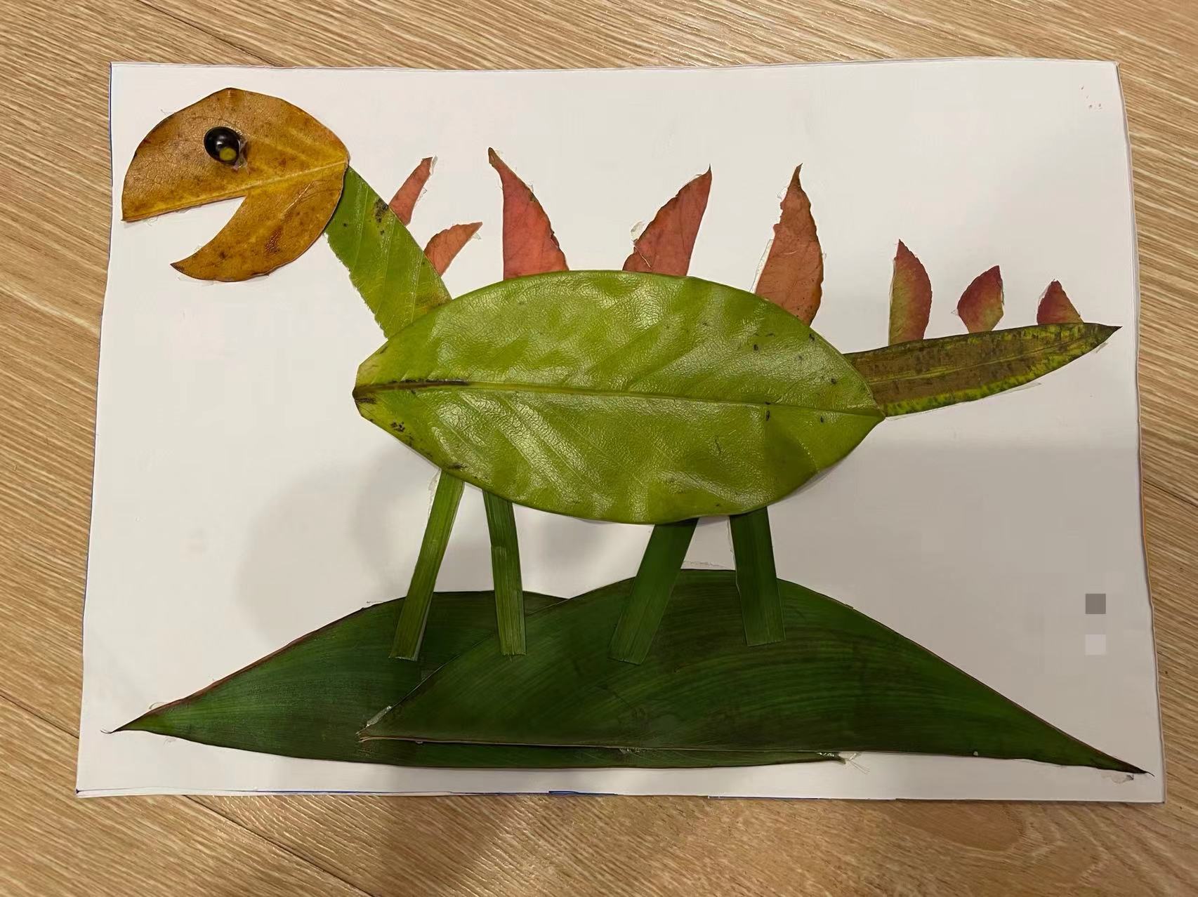 很多男孩子喜欢恐龙,在网上找一个参考,然后根据需要,跟孩子一起捡落叶,树上掉下的小果实是做恐龙眼睛的好素材。