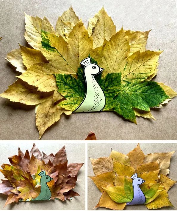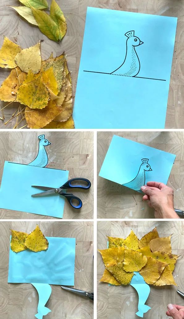 在卡纸的上半部分画出孔雀的身体,剪出外形并折叠。用树叶拼出孔雀长长的羽毛,并粘在卡纸上。