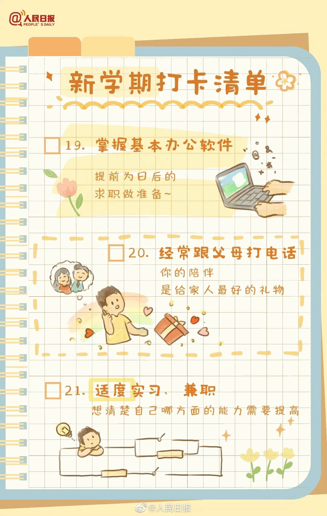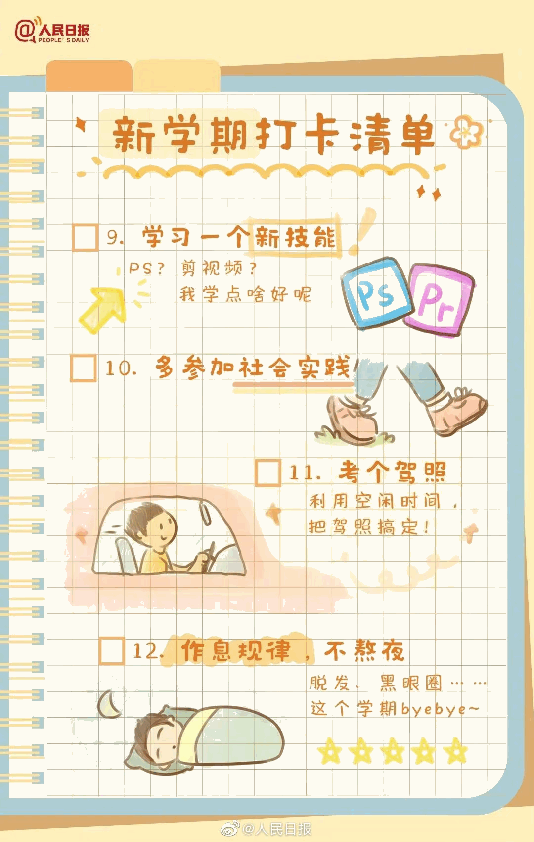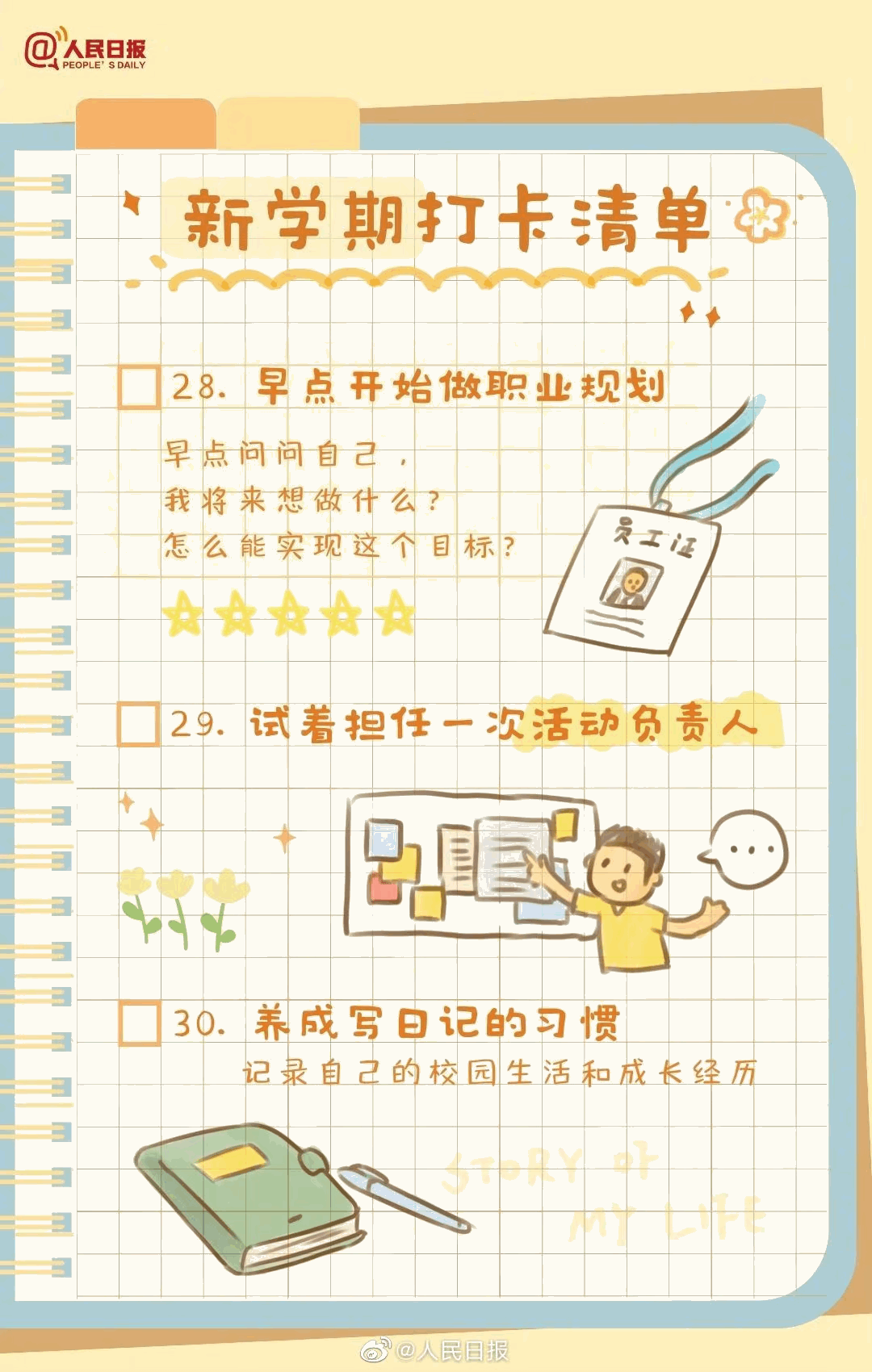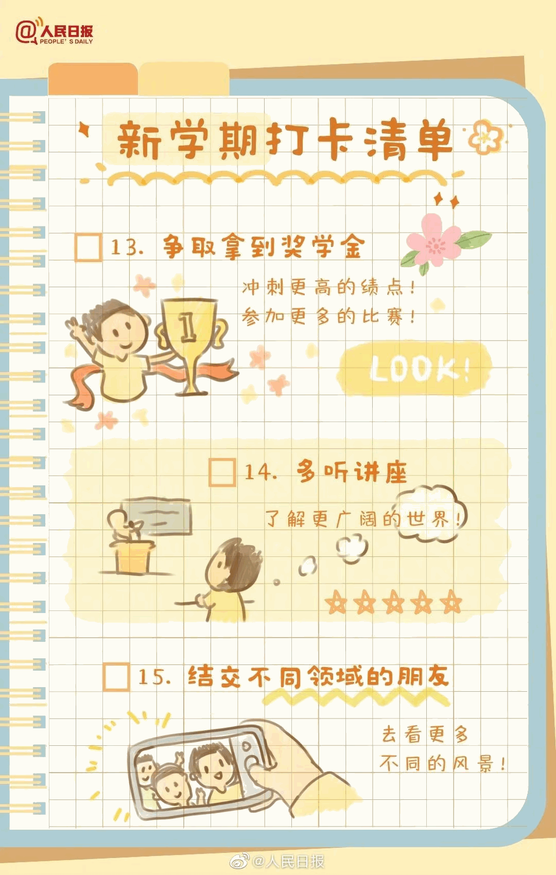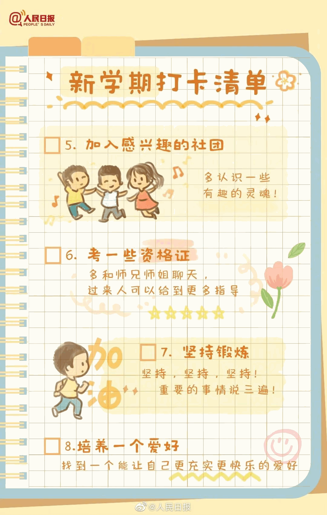 新学期来了,你做好准备了吗?重返校园,请用行动告别迷茫和虚度,别等期末时才追悔莫及。给新学期制定一个目标、找到适合自己的学习方法、坚持锻炼、学习一个新技能…新学期值得打卡的30件事,站在新的起点,一起行动起来!
