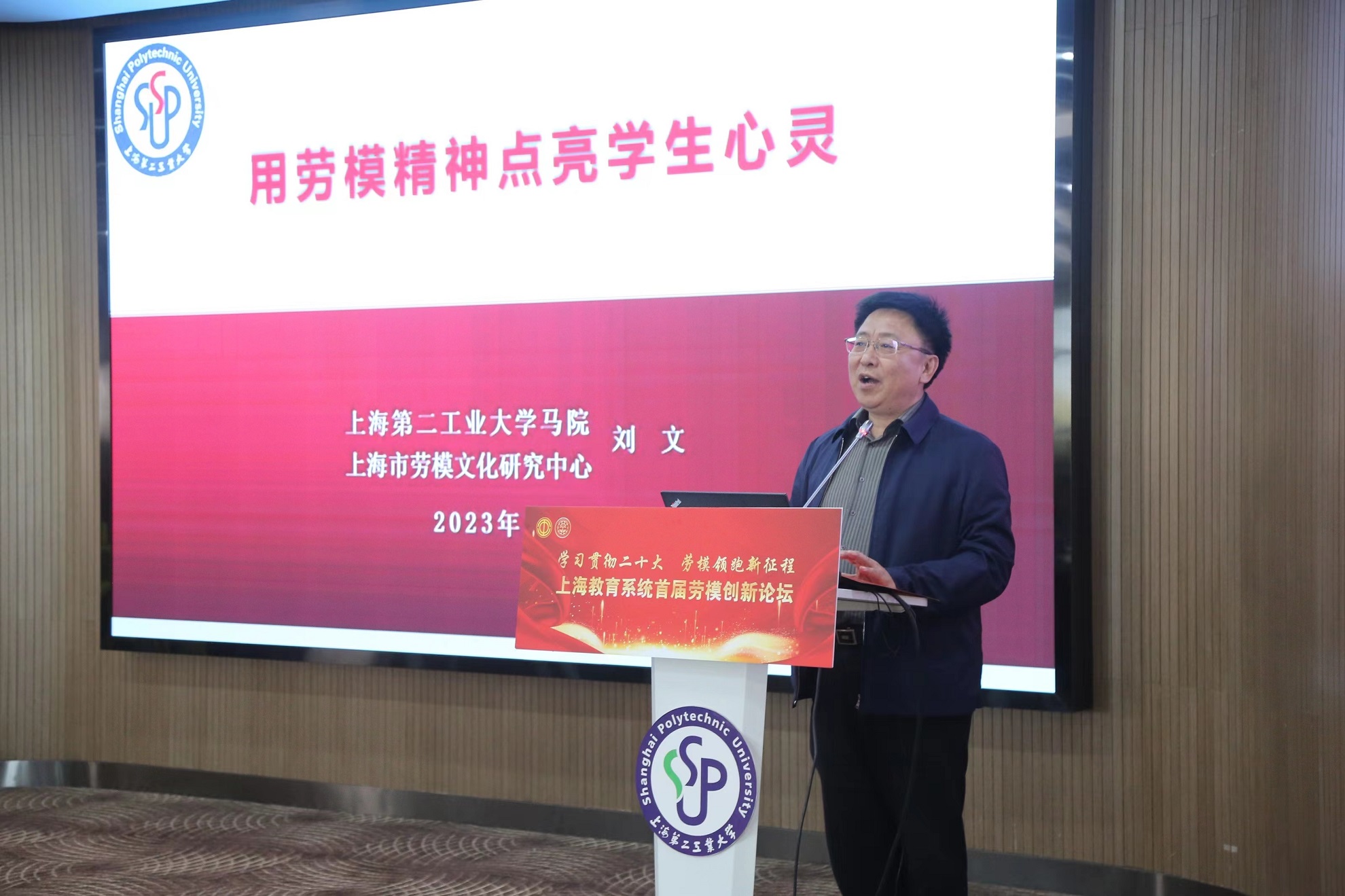 刘文坚持以新思想引领青年成长成才,积极探索劳模文化融入思政教学和社会主义核心价值观日常教育,打造了上海市乃至全国劳模文化研究高地和劳模文化育人品牌。在主题发言中,刘文分享了如何用劳模精神点亮学生心灵的精彩故事,介绍了打造劳模文化研究高地、开创劳模文化育人品牌、深化劳模精神进校园活动等方面的情况。